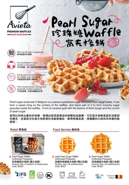 比利時經典窩夫,又叫列日窩夫 (Liège waffle)。依傳統加入珍珠糖(用紅菜頭製成)後,形成誘人的金黃色,以及又薄又脆的糖衣。食落外層香脆,內裡軟熟,牛油香加上焦糖的甜香,令人欲罷不能。