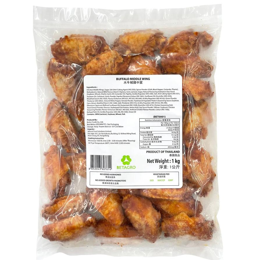 產地: 泰國 典雞翼小食之一,雞翼鬆香惹味,酸香微辣的醬汁,味道層次豐富。 選用泰國無激素、無添加助⾧劑的雞中翼製造。 氣炸鍋:預熱180℃。180-200℃氣炸10分鐘,反轉再炸4-5分鐘。 儲存方法 : 請存放在冰箱儲存 (-18°c)